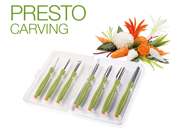 Univerzálna súprava vynikajúca na dekorovanie zeleniny a ovocia – mrkvy, bielej reďkovky a reďkoviek, uhoriek, cukiet, póru, tekvice, jabĺk, hrušiek, manga, melónov apod. Súprava obsahuje 6 špeciálnych vykrajovacích nožov, keramickú brúsku a krabičku pre ich bezpečné uloženie. Vyrobená z prvotriednej nehrdzavejúcej ocele a odolného plastu. Nože sú vhodné do umývačky, brúsku v umývačke neumývajte. Návod na použitie je súčasťou balenia. 3 roky záruka.